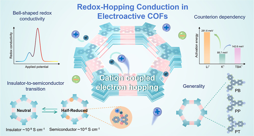 中国科学技术大学的李景国和邹纲团队发表的研究( J. Am. Chem. Soc. 2026, DOI: 10.1021/jacs.6c03330)发现电活性PICOF材料的电子传输可通过氧化还原导电机制实现,即电子在不同氧化态相邻电活性单元间跳跃。以萘二酰亚胺(NDI)基COF薄膜为模型,其表现出两个可逆单电子氧化还原波,对应[NDI]⁰/•⁻和[NDI]•⁻/²⁻对。利用原位紫外-可见光谱电化学技术,可通过调节电极电位精准控制薄膜氧化还原组成,观察到电位依赖的钟形导电性分布,与电子跳跃传输特性一致。该COF薄膜可实现100次可逆绝缘体-半导体转变,表观电子扩散系数(Deapp)和氧化还原导电性均具阳离子依赖性,且该跳跃机制在另外两种NDI基COFs中适用,证明其普遍性。
