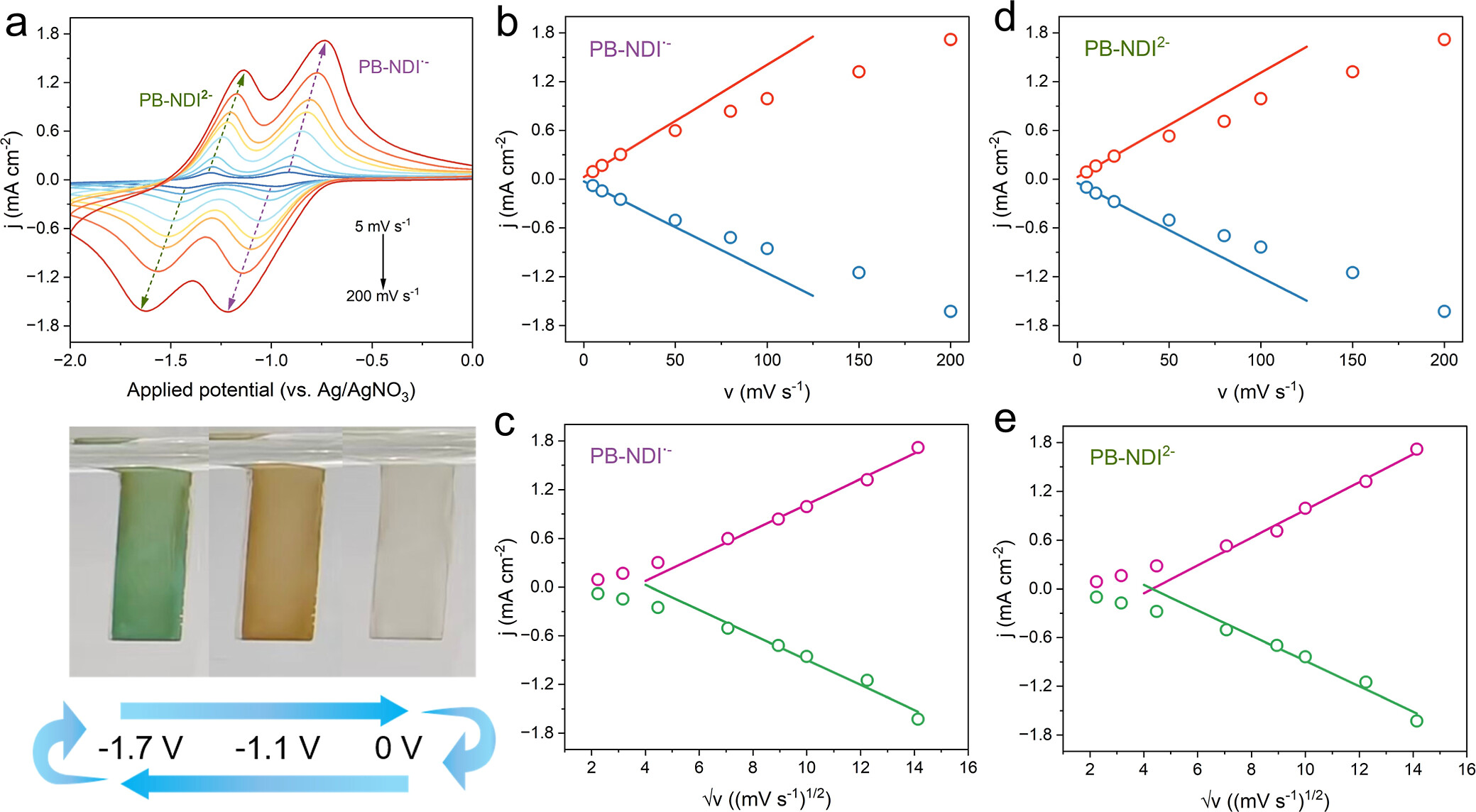 三电极体系下,5~200 mV/s扫描速率测试显示,三种COF均有两个可逆单电子氧化还原波,PB-NDI形式电位为-0.95 V和-1.36 V(vs Ag/AgNO3),且具有明显电致变色特性,电子传输在20~50 mV/s处实现扩散区转变。