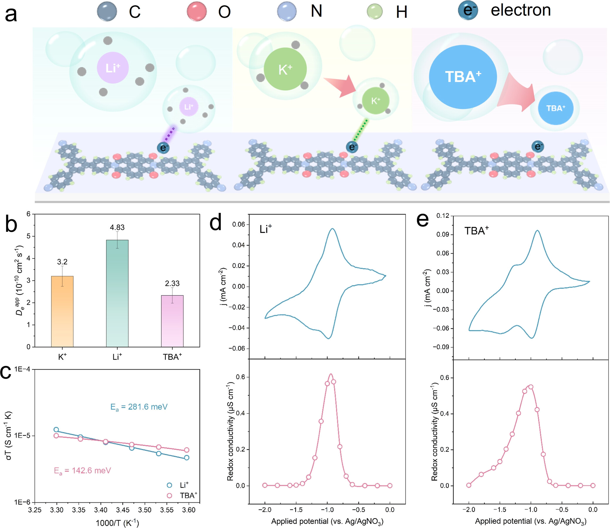 电子跳跃需反离子迁移维持电荷中性,Li⁺迁移快、TBA⁺迁移受阻,阳离子通过离子配对和尺寸效应调控传输性能,反离子迁移是速率限制因素。