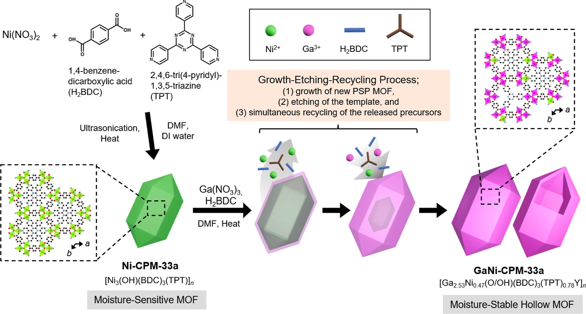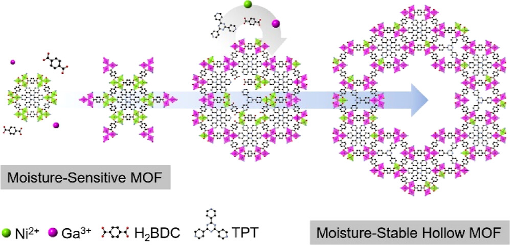 提出Ga³⁺辅助生长-蚀刻-循环工艺,温和条件下实现模板生长、蚀刻与组分循环同步进行,制备的中空GaNi-CPM-33a兼具高稳定性与优异吸附性能,可拓展至不同体系并实现纳米颗粒封装。