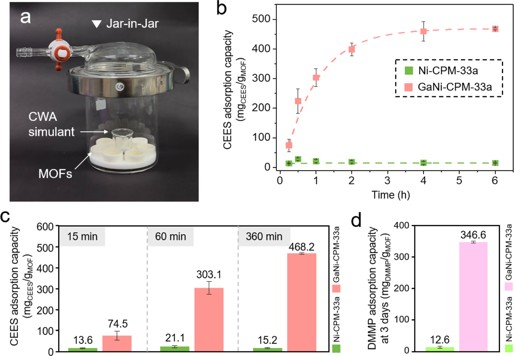 Ga³⁺-CPM-33a对CEES吸附量468.2mg/g(Ni-CPM-33a仅15.2mg/g),DMMP吸附量346.6mg/g(Ni-CPM-33a仅12.6mg/g),4次循环性能稳定;GaNi-CPM-33d CEES吸附量234.8mg/g,稳定性优异。