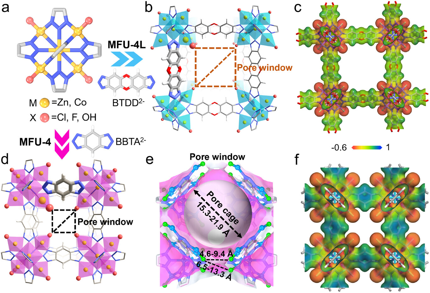 1. 孔结构调谐:MFU-4型材料具有五核SBUs,通过配体长度和末端官能团调控,实现孔径亚埃级变化。Co-MFU-4L孔窗大(边缘9.4 Å),Co-MFU-4孔窗收缩(边缘4.6 Å),Co-MFU-4-F孔窗轻微扩大(5.2 Å),分别对应不同吸附行为。