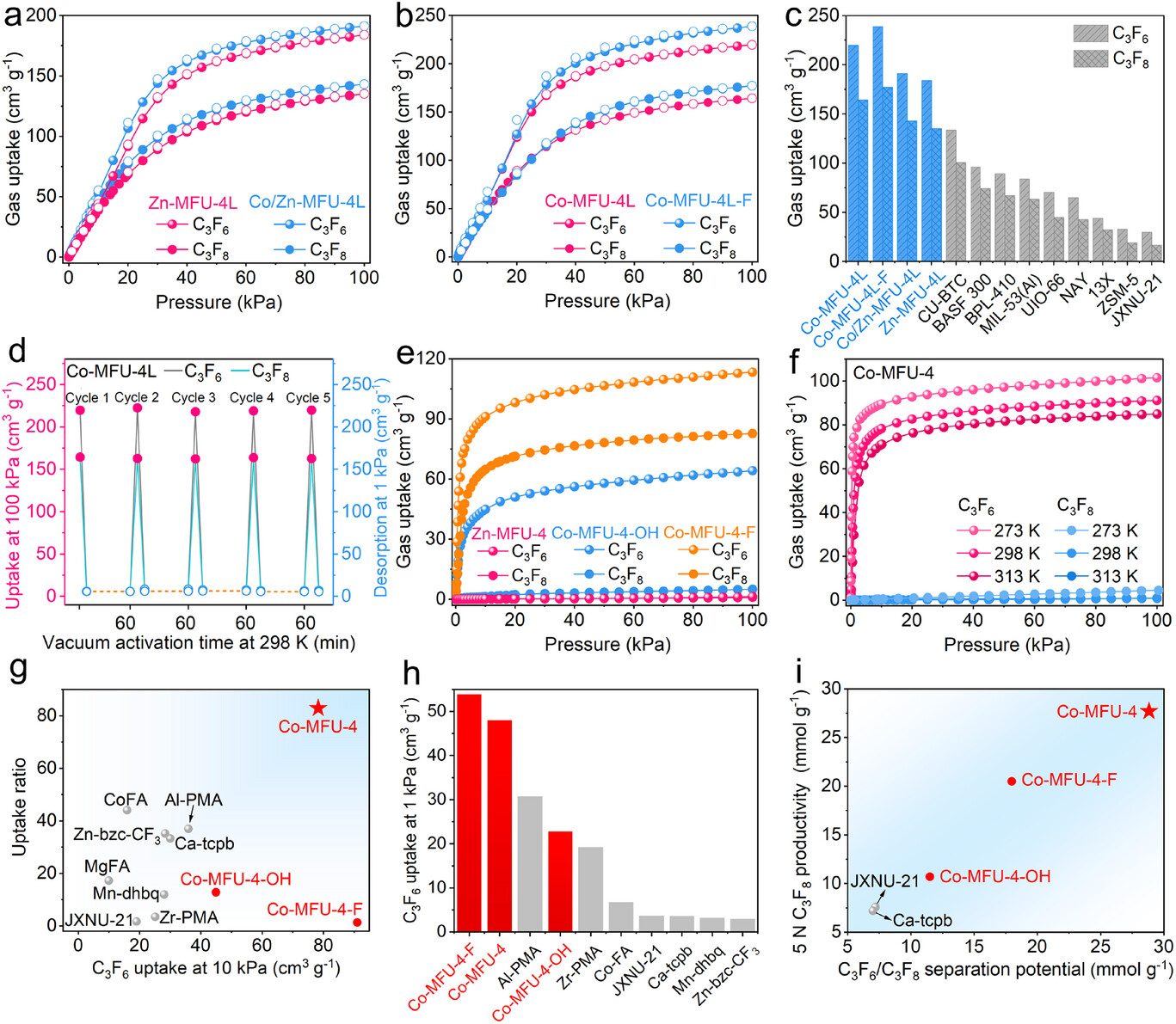 2. 氟代气体吸附:298 K下测试单组分吸附等温线及循环性能。Co-MFU-4L对C3F6/C3F8吸附容量219.7/164.3 cm³ g⁻¹,Co-MFU-4L-F性能更优;Co-MFU-4仅吸附C3F6(91.2 cm³ g⁻¹);Co-MFU-4-F呈现共吸附但C3F6扩散更快。循环再生效率均超96%。