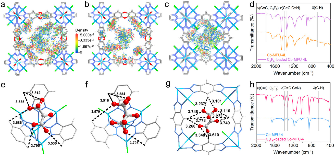 3. 吸附性能测试:Co-MFU-4L对C3F6的Qst为30.8 kJ mol⁻¹,Co-MFU-4为38.1 kJ mol⁻¹;FTIR证实静电相互作用,Co-MFU-4作用更强。