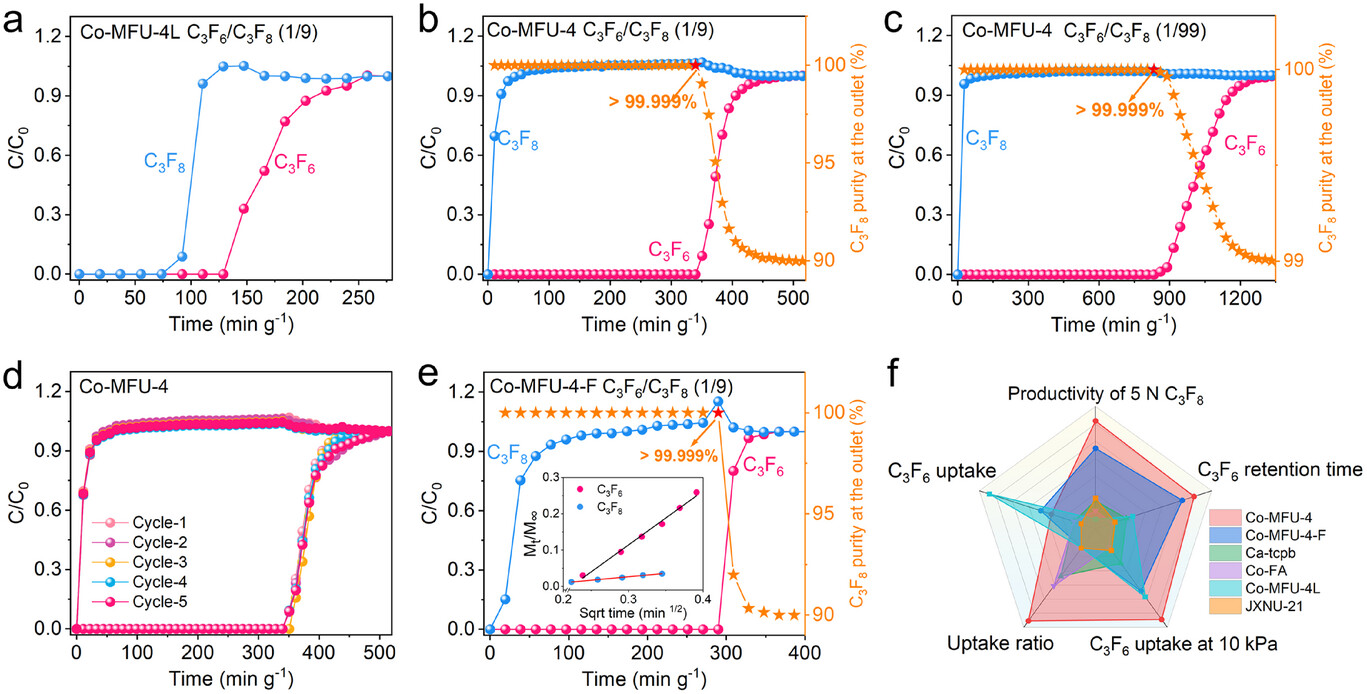 3. 动态穿透实验:测试1/9和1/99体积比混合气体分离性能。Co-MFU-4对1/99混合气体的C3F8产率3.3 L g⁻¹(纯度>99.999%),循环5次性能稳定;Co-MFU-4-F实现动力学筛分,C3F8产率0.46 L g⁻¹。