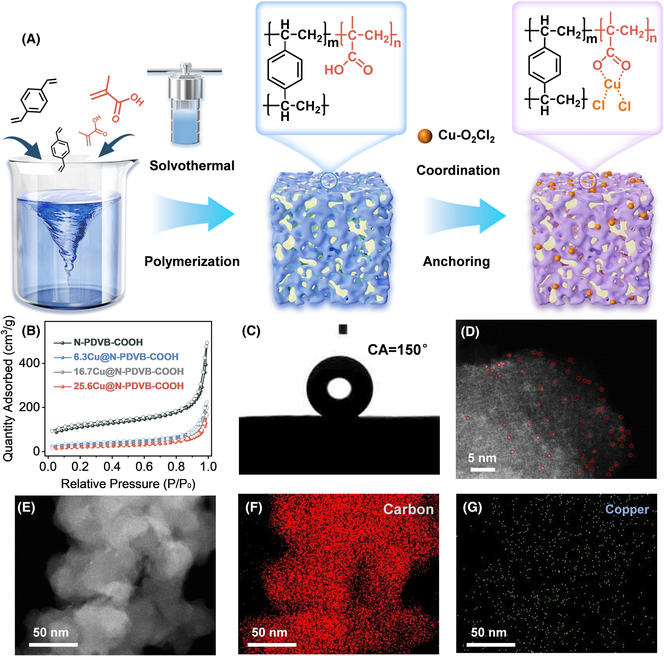 首次将超疏水纳米多孔聚二乙烯苯作为单原子金属载体,利用羧基与铜的配位作用稳定单原子铜,构建 Cu‑羧基活性中心。