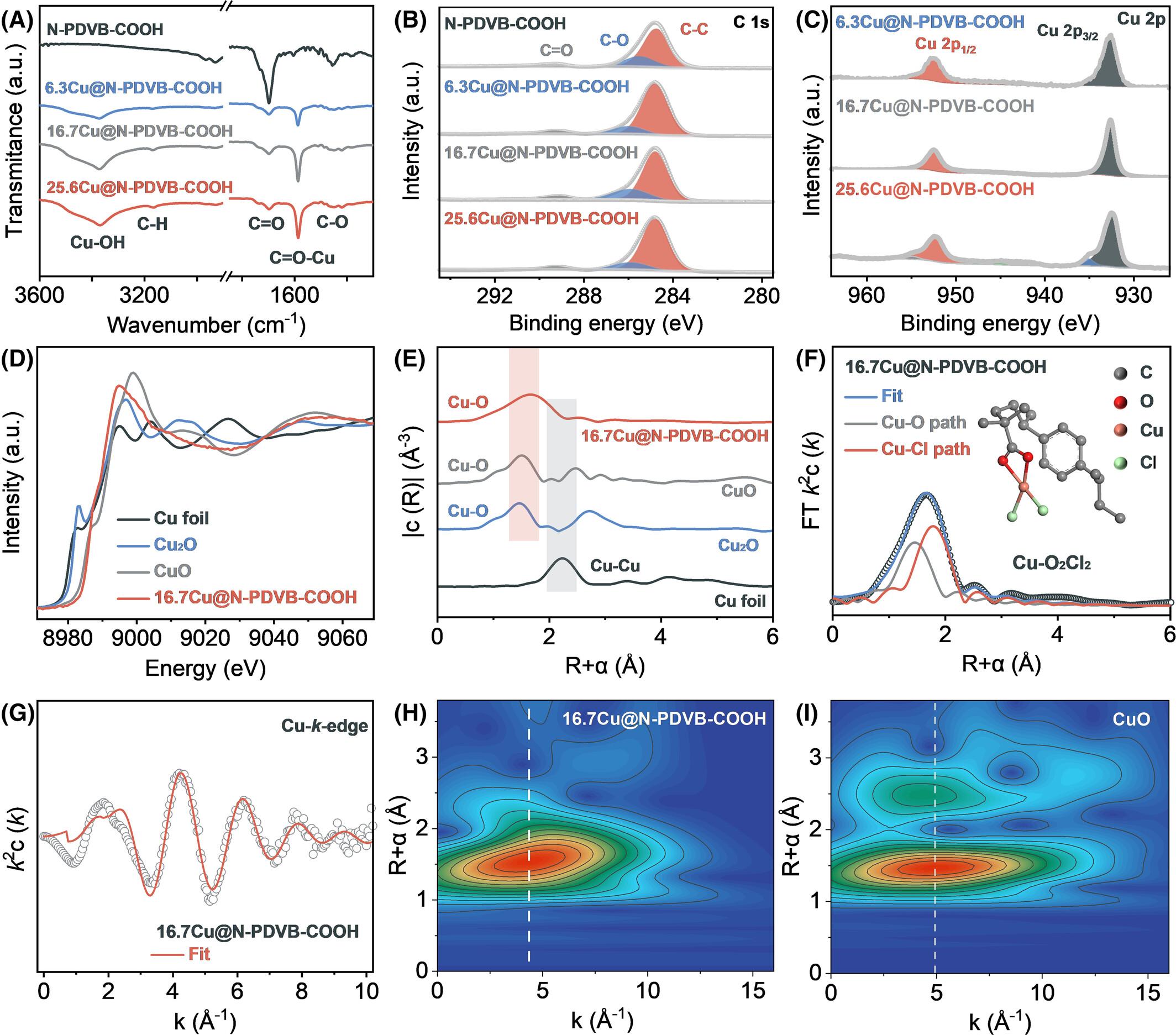 XPS:Cu 以 + 2 价存在,C‑O 与 C=O 信号发生位移,印证 Cu 与羧基的电子相互作用;铜负载量 25.6% 时出现未配位 CuCl₂,验证 16.7% 为最优负载量。
