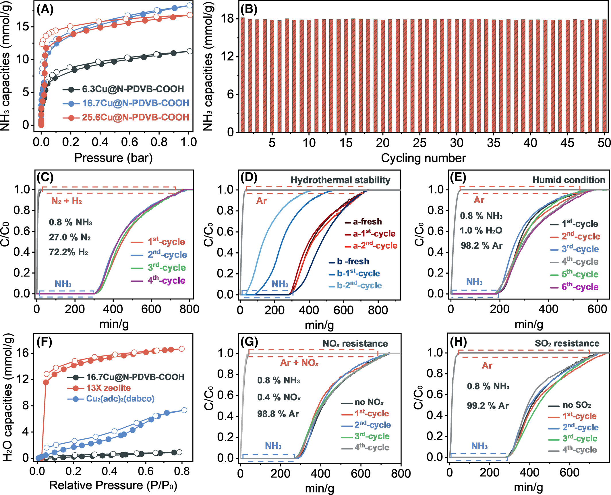 连续进行 50 次吸附‑解吸循环,16.7Cu@N‑PDVB‑COOH 氨气吸附容量保持率超 97%,无明显性能衰减,循环稳定性远超 MOFs 与沸石类吸附剂。