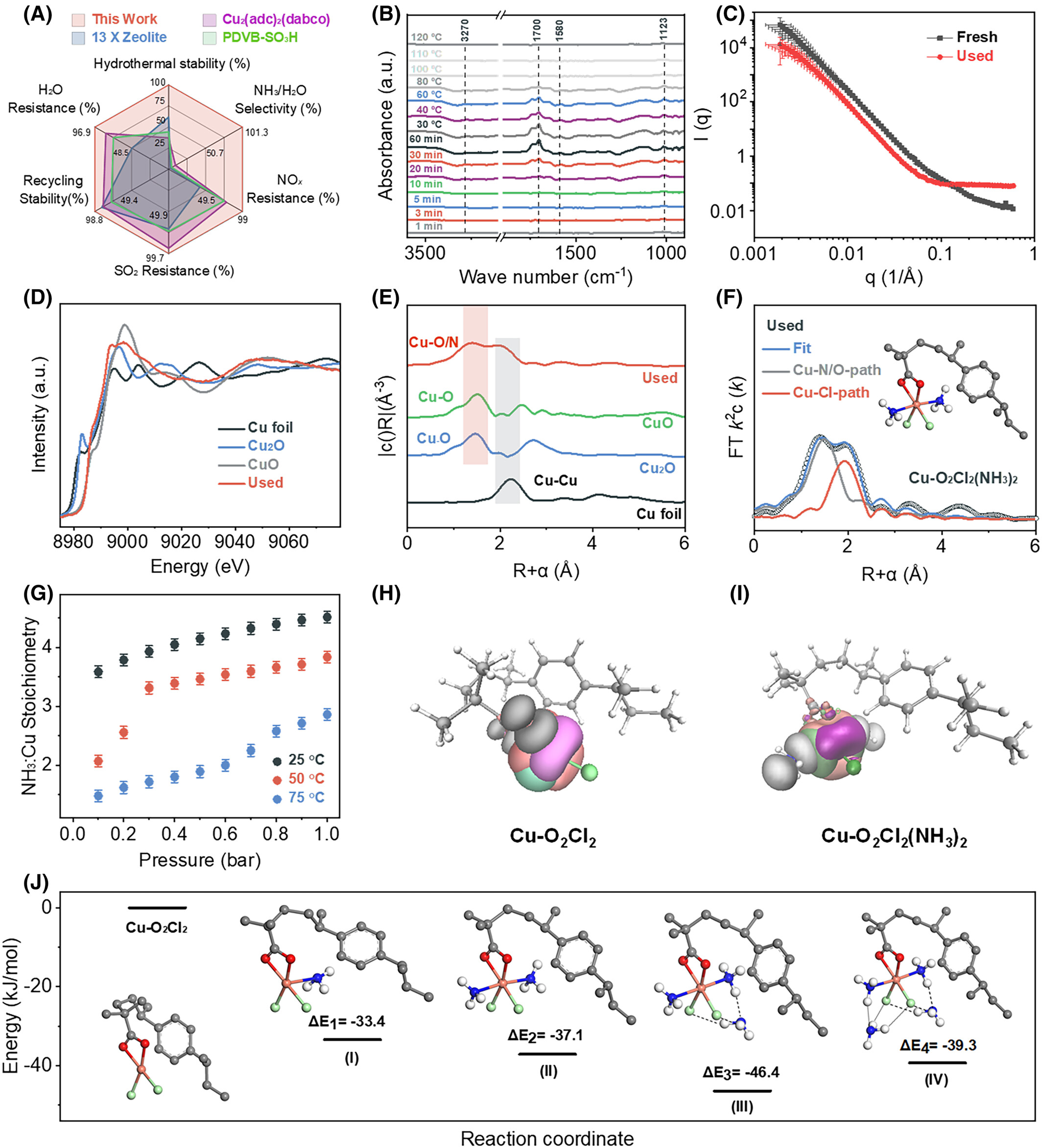 原位 DRIFTS:观测到 NH₃与 Cu 位点形成 Cu‑NH₃σ 配位键,升温后键合可逆解离,证实吸附过程高度可逆。