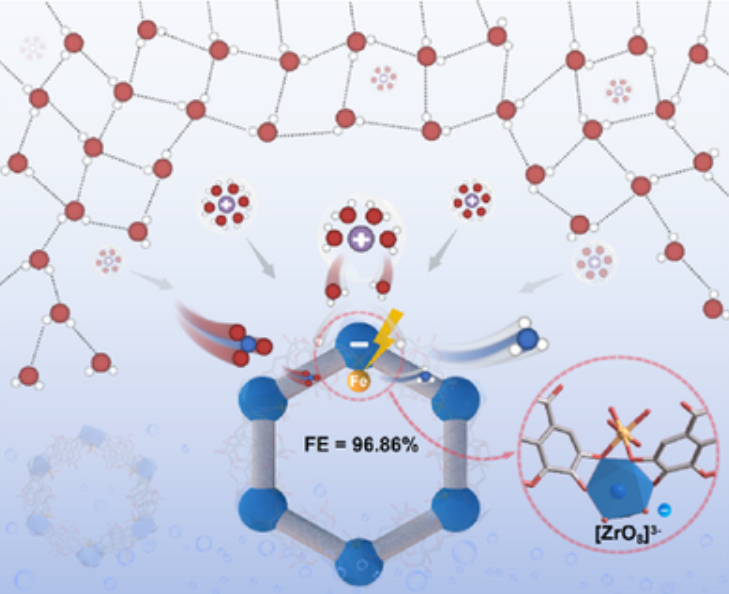 中科大江海龙和广东工业大学何军团队发表的文章(Angew. Chem. Int. Ed. 2026, DOI: 10.1002/anie.8338805)针对中性介质中硝酸盐电还原反应(eNO3RR)质子供应不足、反应动力学缓慢的难题,将单原子Fe位点锚定在阴离子MOF SU-102上,制备出高效电催化剂SU-102-Fe。该催化剂在−0.7 V vs RHE电位下,法拉第效率(FE)达96.9%,NH3生成速率1.72 mg h⁻¹ mgcat⁻¹,远超商业Fe2O3和原始SU-102。原位表征表明,SU-102的负电Zr─O单元在Fe位点周围形成阴离子微环境,富集K⁺•H2O并促进其解离,提升质子供应,加速NO3⁻向NH3转化,为高效eNO3RR催化剂设计提供新策略。