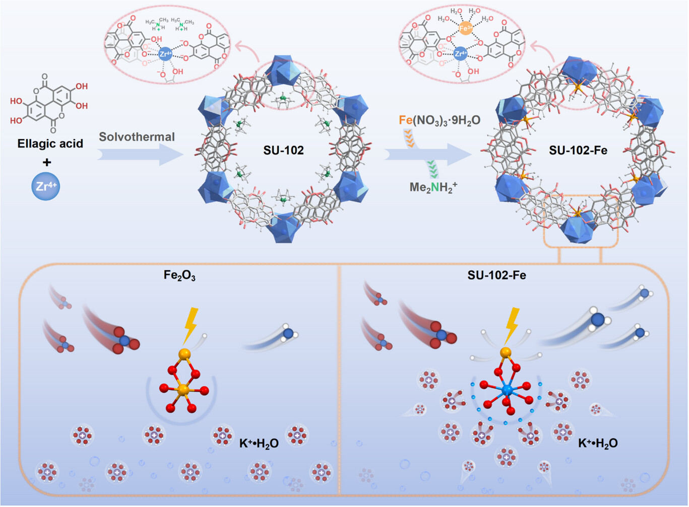 3. 本文创新:以鞣花酸为配体、Zr-氧簇为金属节点合成阴离子MOF(SU-102),经后合成修饰将单原子Fe锚定在其骨架上,制备SU-102-Fe。利用SU-102的阴离子微环境富集K⁺•H2O提升质子供应,依托MOF多孔结构保证Fe位点分散性,显著提升eNO3RR性能,且可克级制备。