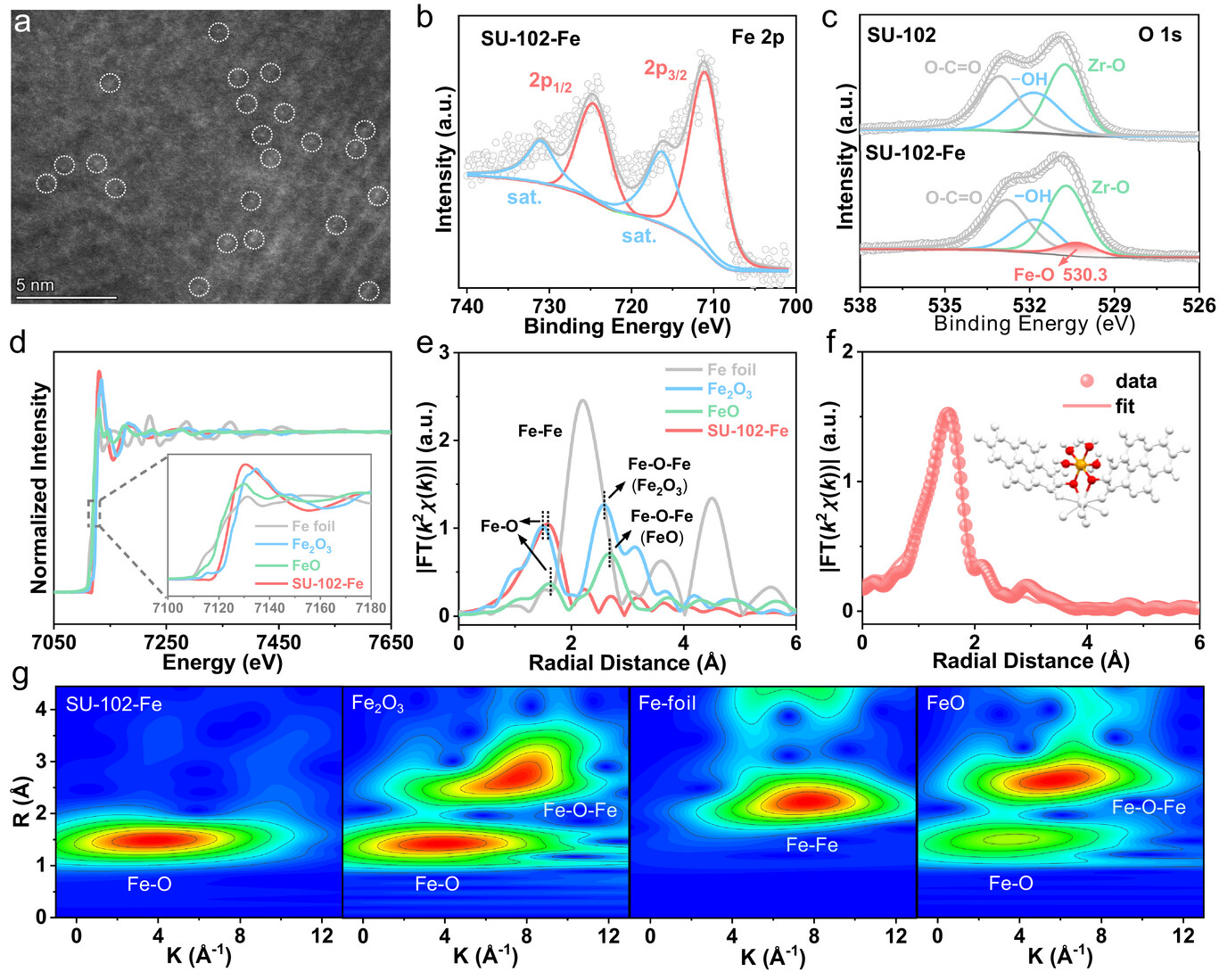 1. 组装机理:SU-102的Zr─O单元带负电且含羟基,与Fe³⁺螯合,Fe³⁺取代二甲铵阳离子锚定在骨架上,形成单原子Fe位点,不破坏MOF结构与多孔性。