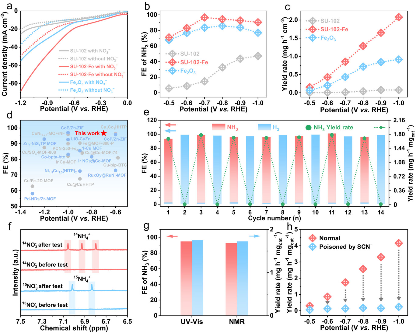 2. SU-102-Fe在中性介质中表现出优异的eNO3RR性能,法拉第效率和NH3生成速率显著优于现有基准催化剂;可在模拟工业废水中稳定工作,Fe位点锚定牢固、泄漏量低,具备实际应用潜力;