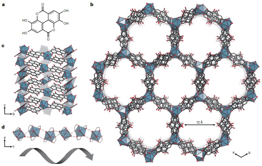 PXRD、3D 电子衍射(microED):SU‑102 属菱方晶系 R‑3c 空间群,一维蜂窝孔道,孔径 12 Å;Zr⁴⁺以 ZrO₈四方反棱柱配位,每个金属中心与 4 个鞣花酸配体螯合,骨架高度有序。