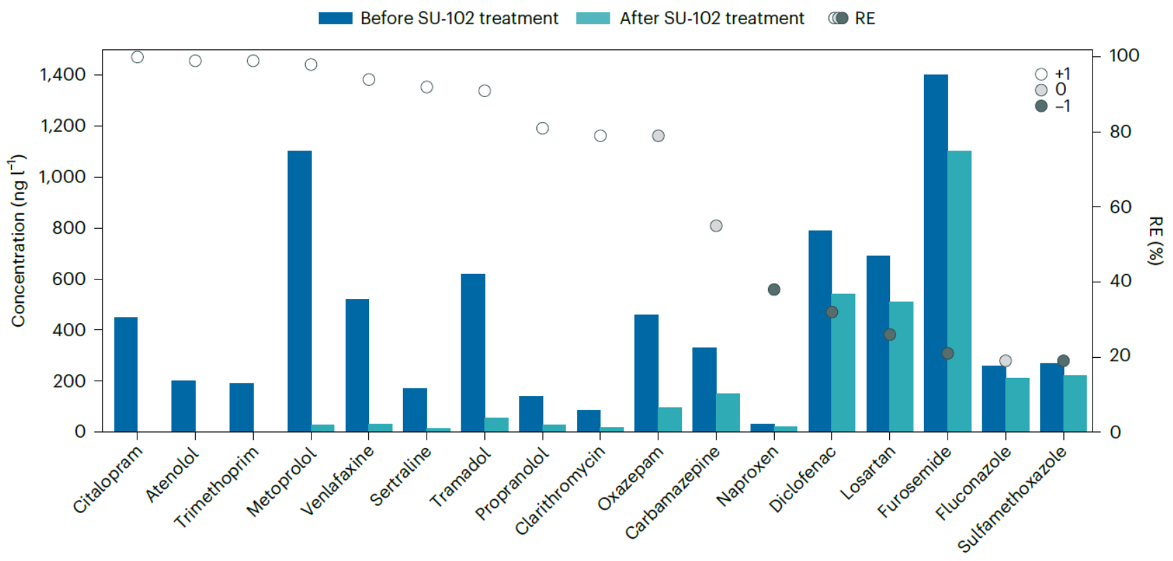 采集瑞典斯德哥尔摩污水厂 MBR 工艺出水,投加1 mg/mL SU‑102,搅拌 24 小时后过滤,采用HPLC‑MS/MS定量检测 17 种药品污染物浓度,计算去除率(RE),验证真实水体中应用效果。
