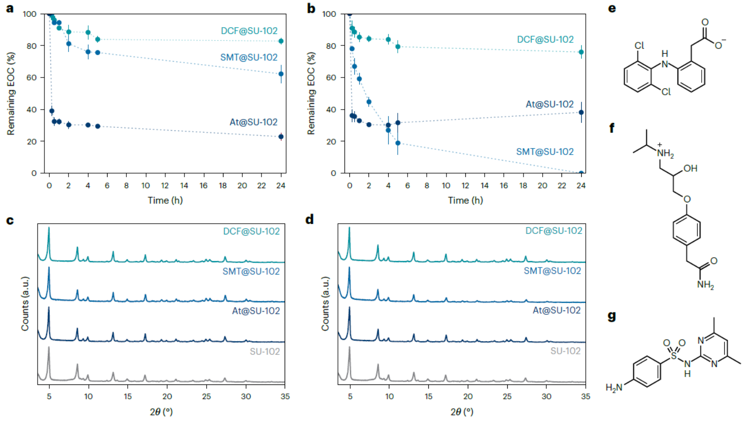 SU‑102 在真实市政污水中对阳离子药品污染物实现 **79%–99.6%** 高效去除,是首个在未加标真实污水中验证效果的 MOF 吸附剂,工程价值突出。