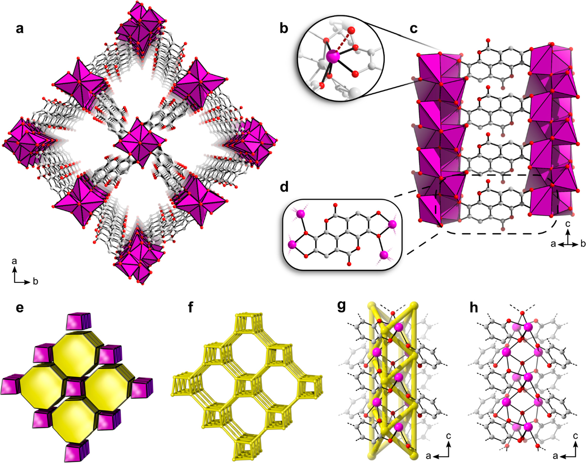 3DED+HR‑PXRD:一维孔道直径 6–7 Å,拓扑为单节点 7 配位 svd 网;铋为六配位,与酚氧、μ₄‑氧及配位水结合。
