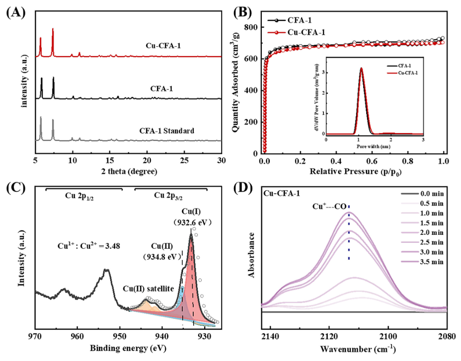 PXRD:Cu‑CFA‑1 保持 CFA‑1 晶体结构,无骨架坍塌。