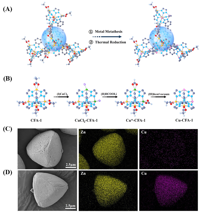 2. Cu‑CFA‑1 制备:CFA‑1 与 CuCl₂在 DMA 中进行金属离子交换得到 CuCl₂‑CFA‑1;经甲酸锂甲醇溶液阴离子交换,再真空热还原,获得含三角锥 Cu (I) 位点的 Cu‑CFA‑1,组成为 Zn₃Cu₂(OAc)₂(bibta)₃,单批次可克级制备,总收率约 70%。