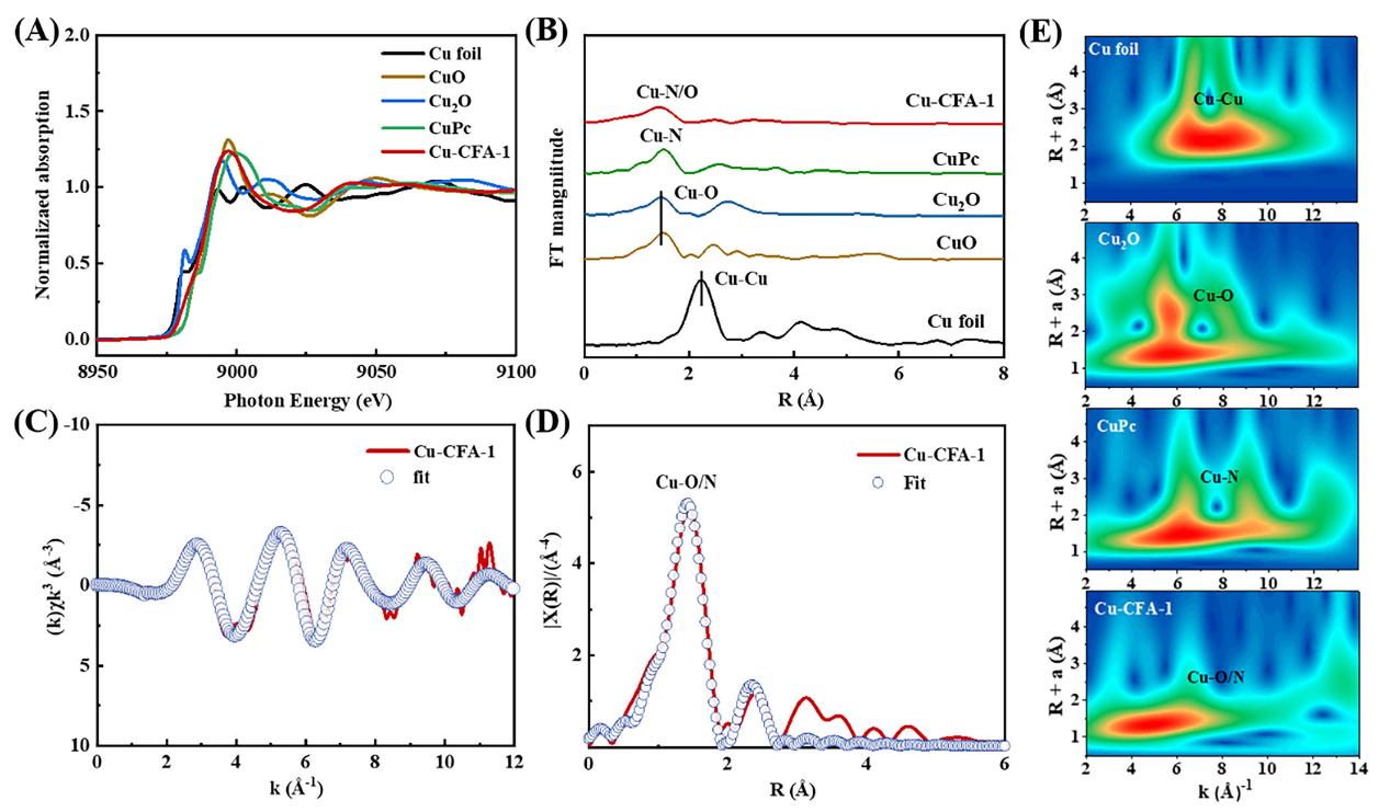XANES/EXAFS:Cu 价态平均 1.23,Cu‑N/O 配位峰 1.51 Å,无 Cu‑Cu 峰,呈原子级分散;配位数约 3.4,符合 Cu (I)‑3N 预测模型。