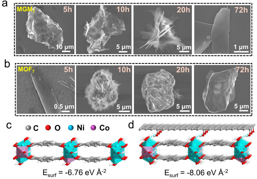 MOF 暴露表面以金属‑氧八面体为主,配体结构对表面能影响小,更换芳香二羧酸配体仍可维持超薄二维形貌;Co 比例过高易致棒状结构,Ni:Co=7:3为最优组成。