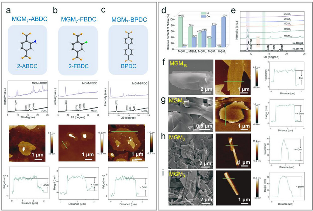 更换配体为 2‑氨基对苯二甲酸(2‑ABDC)、2‑氟对苯二甲酸(2‑FBDC)、4,4’‑联苯二甲酸(BPDC),分别合成 MGM₇‑ABDC、MGM₇‑FBDC、MGM₇‑BPDC,验证配体适配性;调控 Ni/Co 比例制备 MGM₁₀、MGM₅、MGM₃、MGM₀,探究金属组成对形貌与性能的影响。