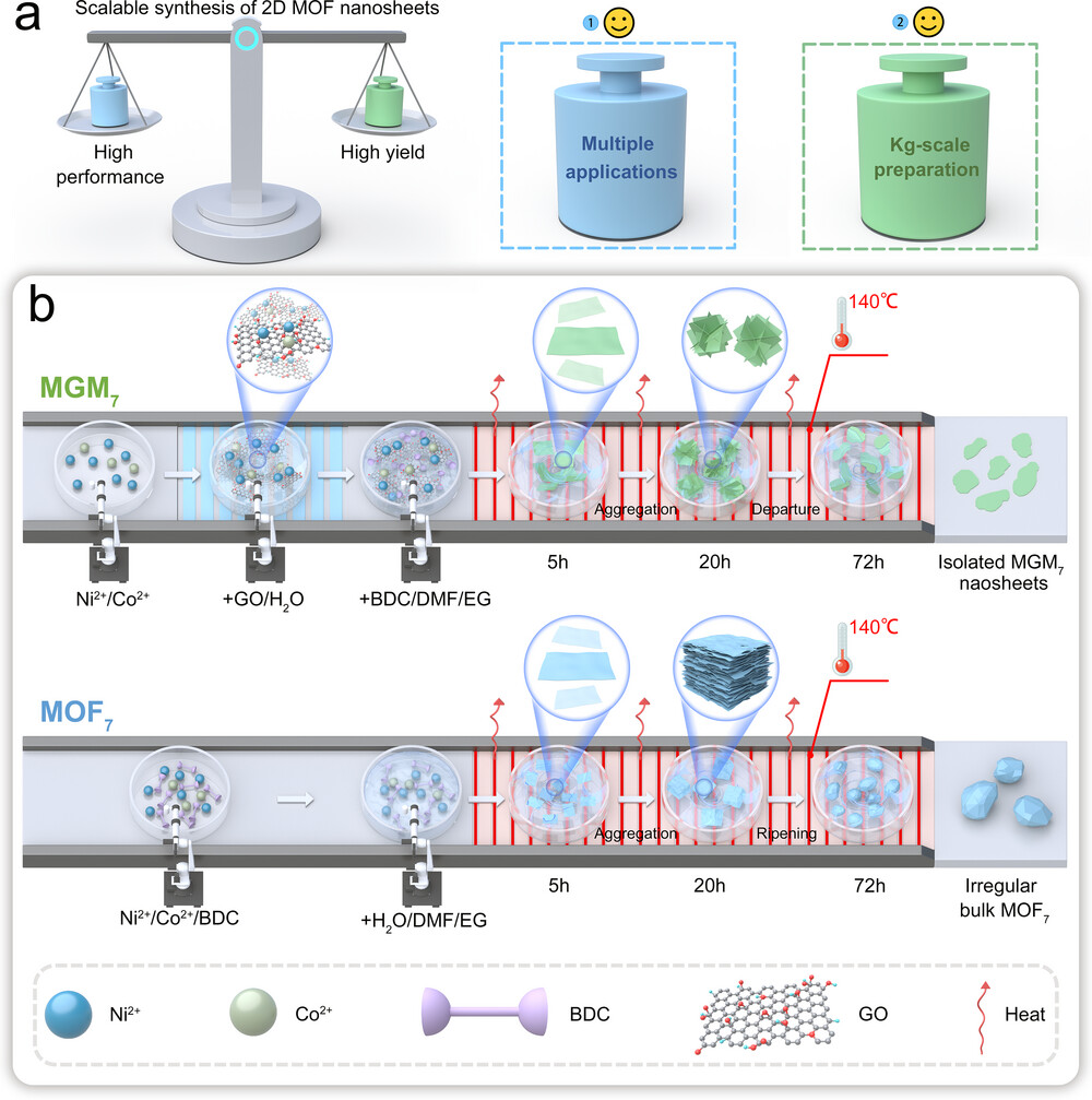 以 Ni²⁺/Co²⁺盐、BDC 配体、单层 GO 为原料,在 DMF/EG/H₂O 混合溶剂中140℃回流 72 h,一锅制备 MGM₇(下标 7 为 Ni 初始摩尔比);对照组不加 GO 制块体 MOF₇,按文献法制备常规超薄 MOF 纳米片 UMN₇,实现单批次1 kg 级制备,金属收率98.73%,溶剂可回收复用。