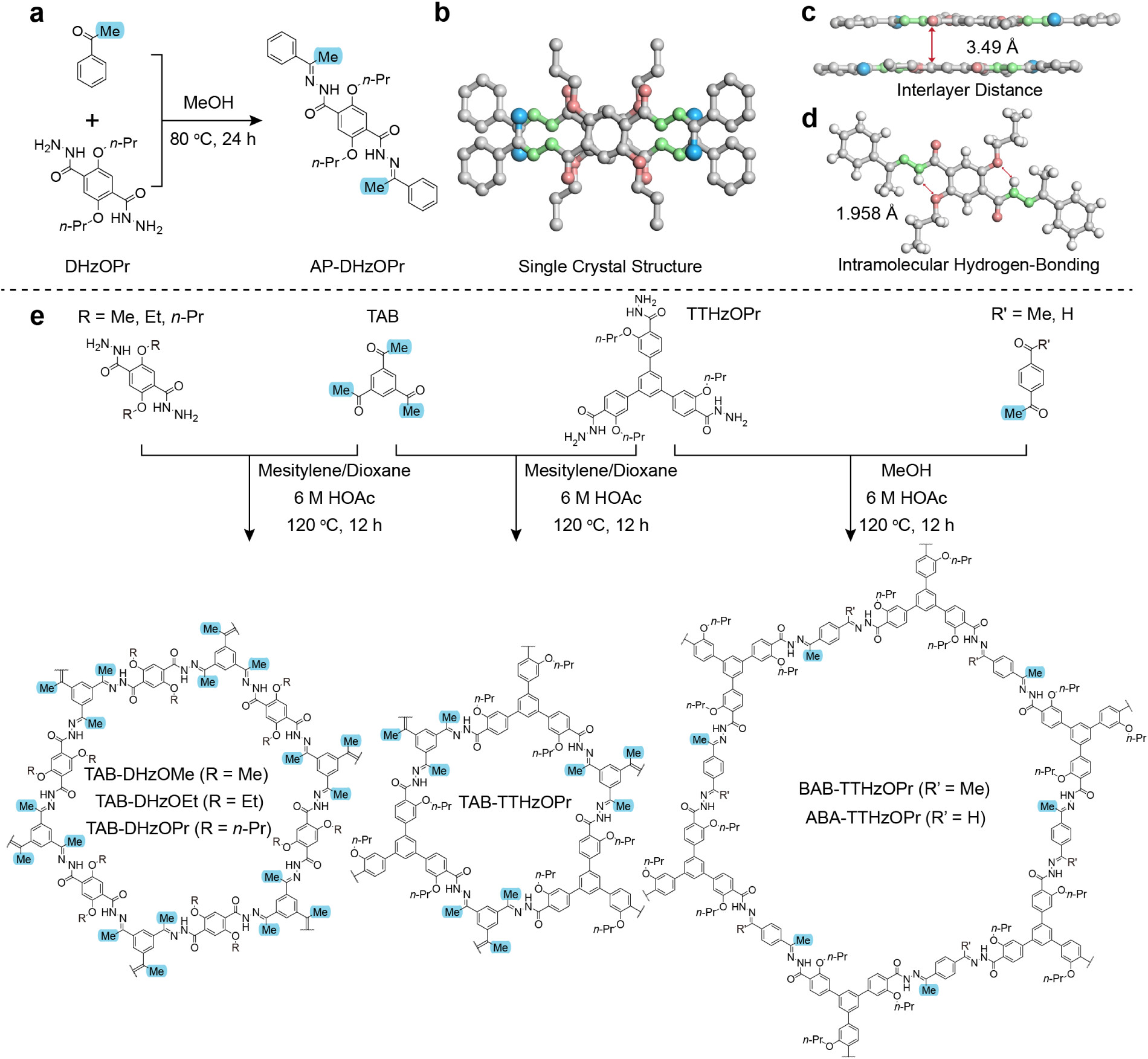 实现反平行堆叠高结晶框架,在单一晶格中同时引入带甲基与不带甲基的腙键,丰富结构可调性。
