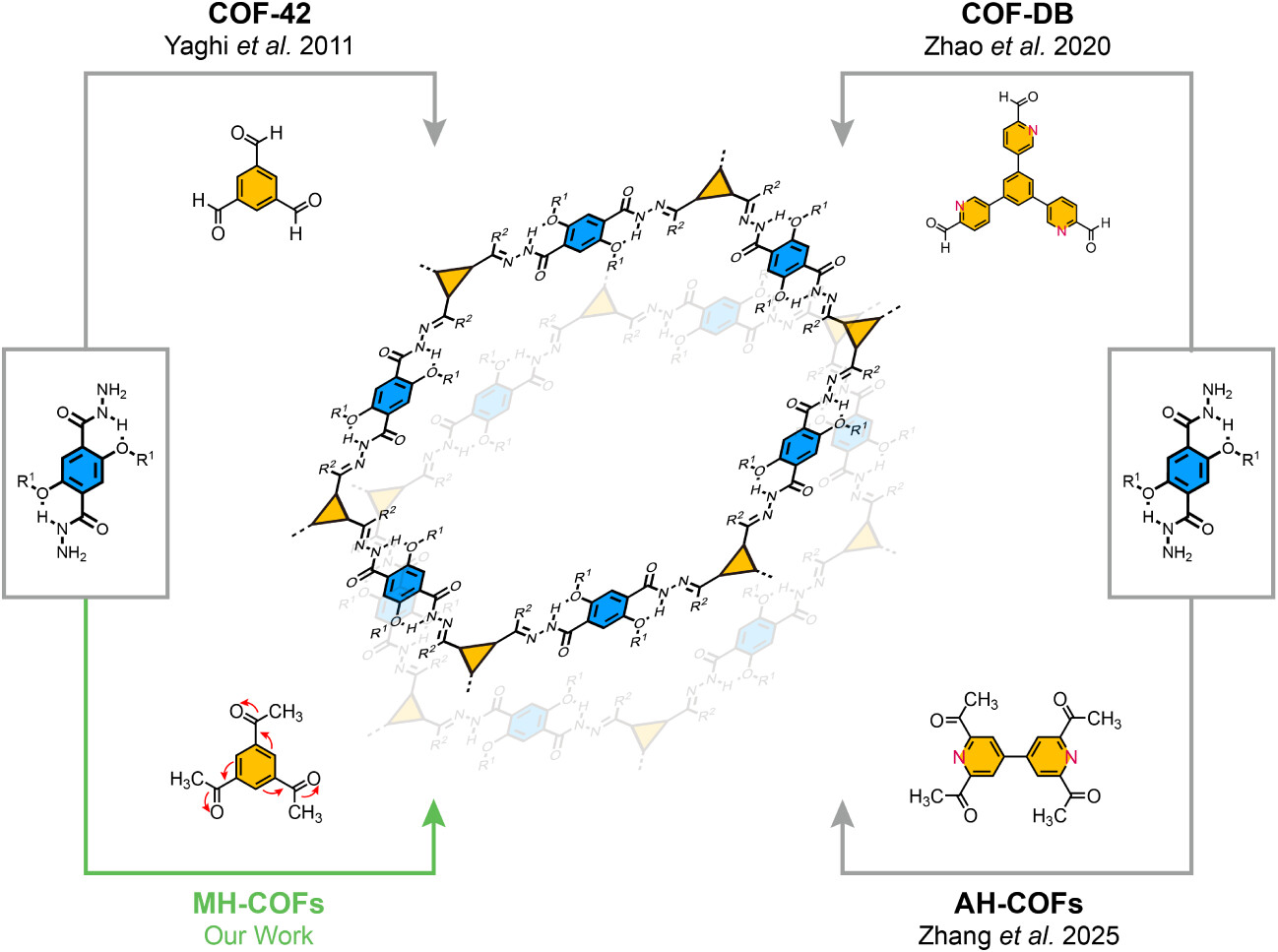 首次实现芳香酮直接缩合制备高结晶腙键 COFs,原料成本与合成步骤大幅简化。