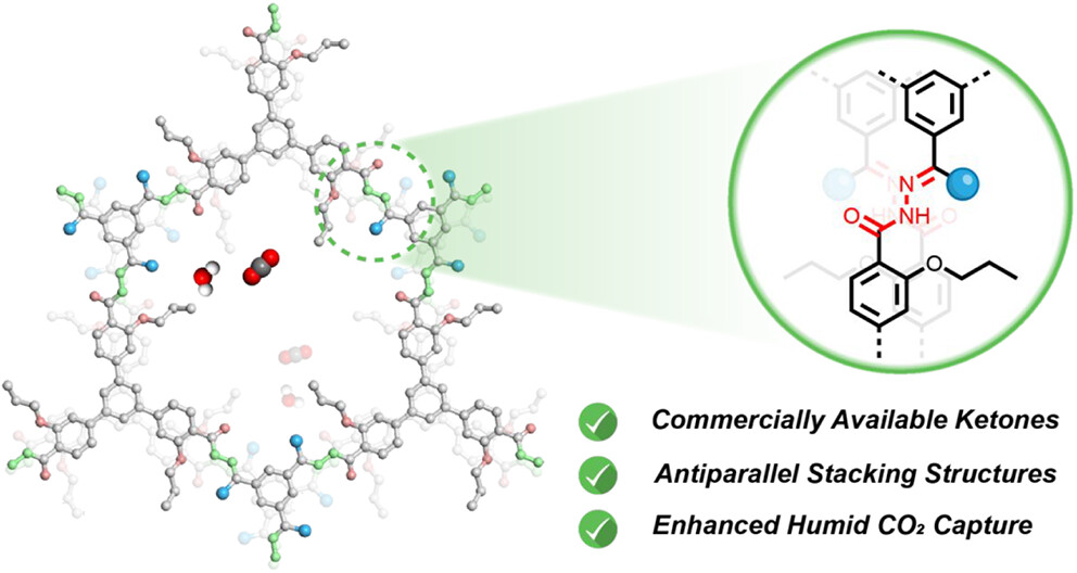 中国科学院大学高强、魏伟老师课题组,东华大学钱成老师课题组、常州大学赵宇培老师课题组联合团队研究并报道腙键型共价有机框架(COFs)是一类兼具结构柔性、丰富杂原子位点与优异水解稳定性的晶态多孔材料。传统腙键 COFs 多依赖醛类与酰肼缩合制备,芳香酮因反应活性低极少用作亲电构筑单元。本文报道一种酮基自活化策略,直接以未取代芳香酮与酰肼单体高效合成甲基化腙键连接二维 COFs(MH‑COFs),可快速形成反平行堆叠框架,产物结晶度与稳定性突出。其中代表性材料 TAB‑DHzOPr 在 1 atm、273 K 下 CO₂吸附量达45.1 cm³ g⁻¹,CO₂/N₂分离选择性(IAST,15/85,273 K)高达34.3;更重要的是,该材料在潮湿气氛下经4 次以上穿透循环仍保持强化 CO₂捕获性能,为酮基腙键化学在功能多孔框架开发中的应用提供新范式。