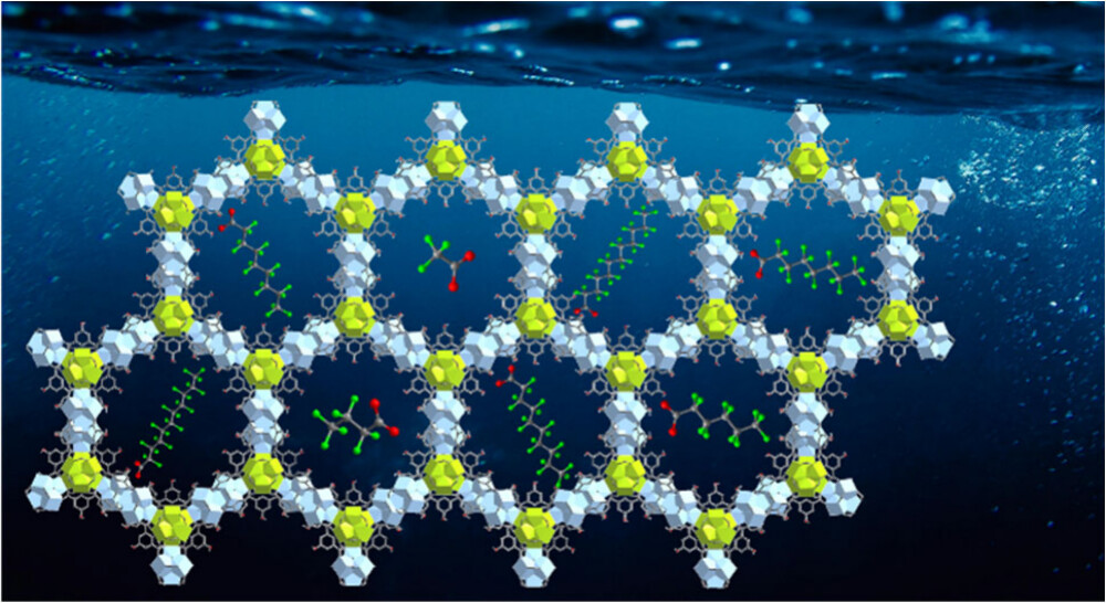 西班牙ICP-CSIC研究所的Sergio Marugán-Benito等学者(ACS Materials Lett. 2026, DOI: 10.1021/acsmaterialslett.6c00186)针对水中全氟及多氟烷基物质(PFAS)污染难题,利用MIP-206基金属有机框架(MOFs)的大介孔结构和不饱和无机节点,实现对全氟羧酸(PFCAs)的高效吸附。该类材料对长链PFCAs数秒内去除效率超99%,MIP-206-OH的PFOA最大吸附容量达1758 mgPFOA/gMOF,跻身高性能MOF行列,且循环稳定性、选择性优良,结合同步辐射表征揭示吸附机理,为PFAS污染修复提供高效方案。