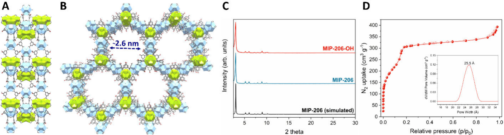 1. 结构表征:PXRD证实两种MOF同构、结晶度高,吸附及循环后结构稳定;FT-IR验证官能团;77 K N₂吸附显示孔径2.3-2.6 nm,MIP-206-OH介孔特征更显著。