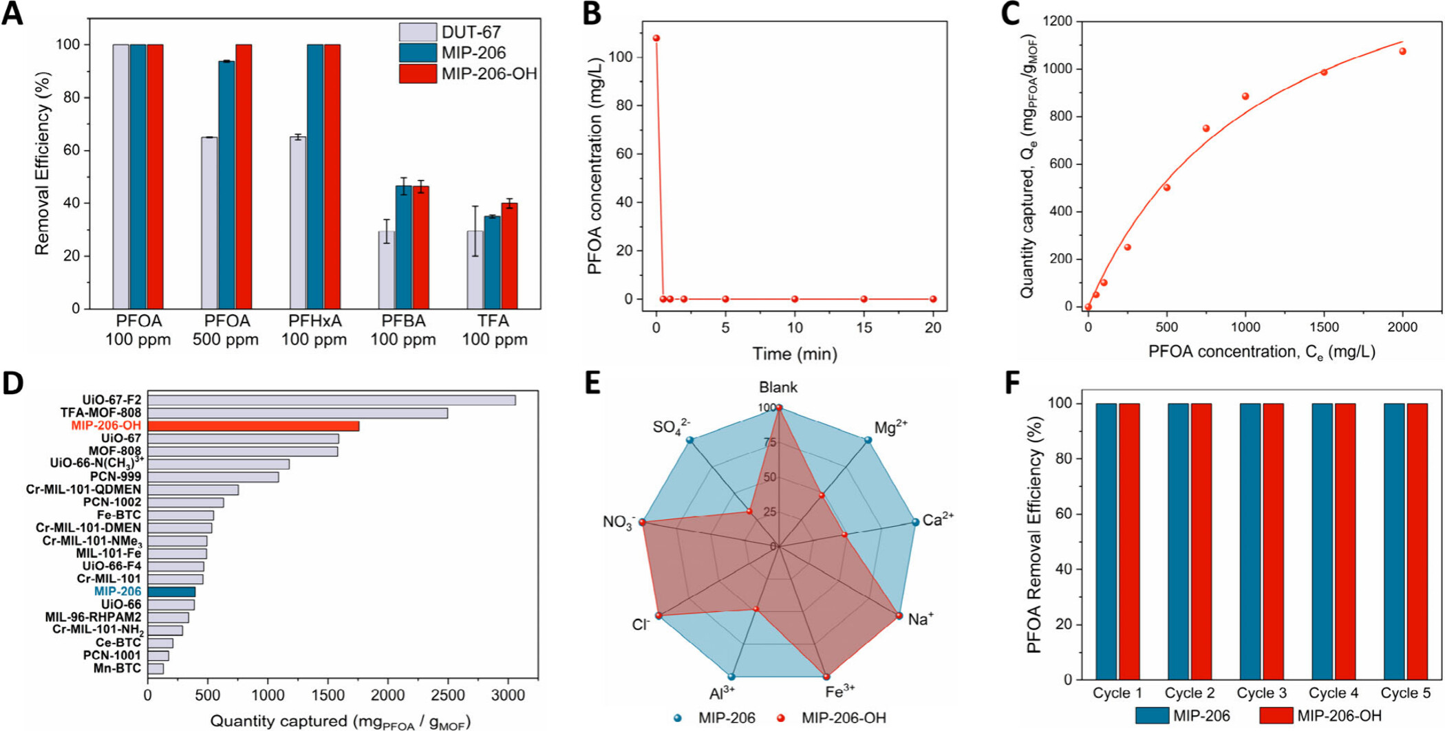 3. 容量与循环实验:Langmuir拟合显示,MIP-206最大吸附容量395 mgPFOA/gMOF,MIP-206-OH达1758 mgPFOA/gMOF;5次循环后性能稳定,PXRD证实框架结构完好。