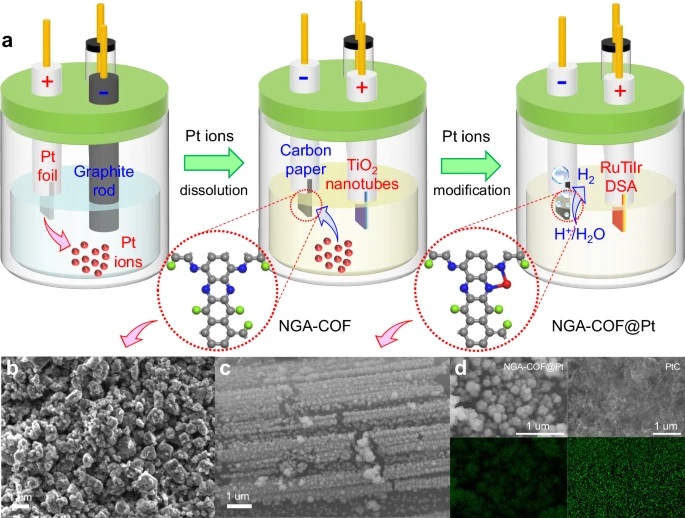 b) 在0.5 M H2SO4溶液中进行2000个循环伏安段的电化学修饰,在NGA-COF上锚定铂单原子。