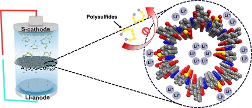 3. 本研究通过在氧化铝基底上原位生长磺酸功能化的共价有机框架(SO3-COF),制备了Al2O3-G-COFSO3复合隔膜。该复合材料不仅提供了快速的Li+传输通道,而且通过磺酸基团的离子选择性有效抑制了多硫化物的穿梭,提高了Li-S电池的效率和循环稳定性。