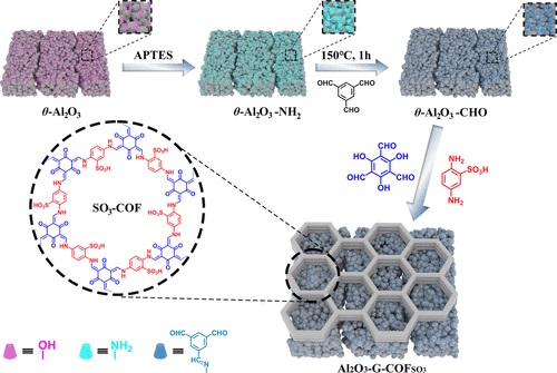 2) 制备过程:首先,将纳米氧化铝在氮气氛围下1200°C焙烧2小时形成θ-Al2O3,然后用(3-氨基丙基)三乙氧基硅烷(APTES)处理以获得氨基化的θ-Al2O3–NH2,最后与1,3,5-苯三甲醛反应生成θ-Al2O3–CHO。之后,通过在甲三烯和1,4-二氧六环的混合溶剂中聚合1,3,5-三甲醛苯酚(TFP)、2,5-二氨基苯磺酸(Pa-SO3H)和改性的氧化铝基底(θ-Al2O3–CHO)来生成Al2O3-G-COFSO3。