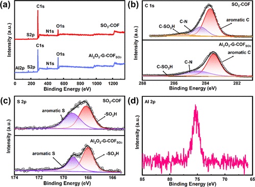 1) 比表面积和孔隙性分析:通过77K下的氮气吸附-脱附等温线测量SO3–COF和Al2O3-G-COFSO3的比表面积分别为45.6和24.5 m2 g–1,孔体积分别为0.12和0.09 cm3 g–1。通过非局域密度泛函理论(NLDFT)方法计算的孔径分布显示两个聚合物在1-2nm范围内具有宽孔径分布。