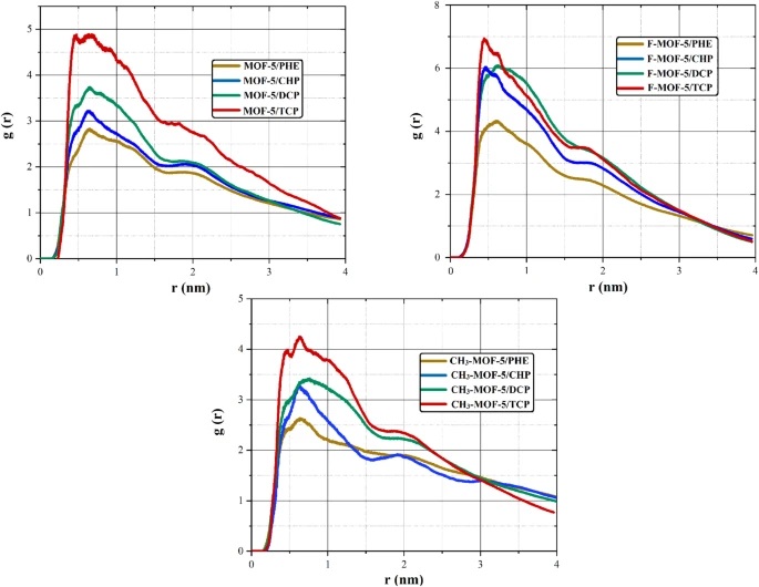 - RDF分析用于评估污染物分子与MOF-5/功能化MOF-5之间的相互作用距离。