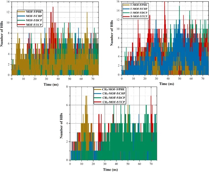 - 例如,在F-MOF-5/污染物系统中观察到的HB数量多于其他系统,表明了-F功能团增加了吸附剂表面的HB数量。