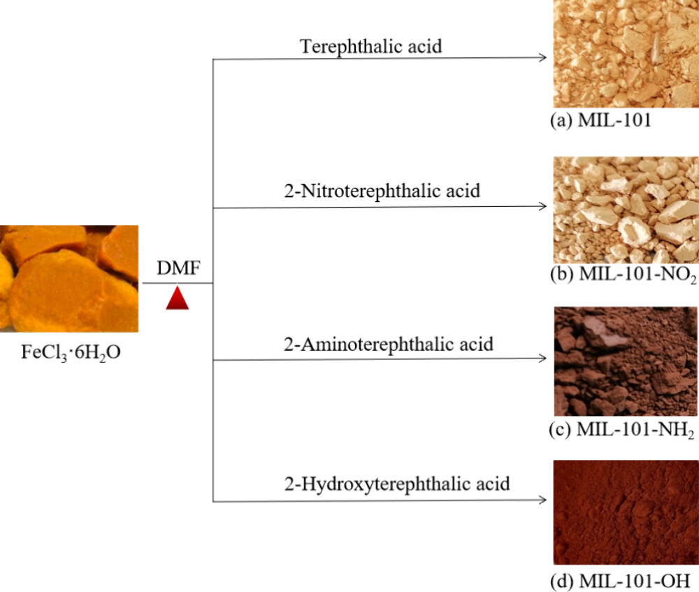 1. 将FeCl3·6H2O和不同的有机配体(如对苯二甲酸、2-硝基对苯二甲酸、2-氨基对苯二甲酸和2-羟基对苯二甲酸)以一定比例混合在N,N-二甲基甲酰胺(DMF)溶剂中,加入醋酸后,转移到溶剂热反应器中,在110°C下反应24小时,得到不同颜色的MIL-101(Fe)-X粉末。