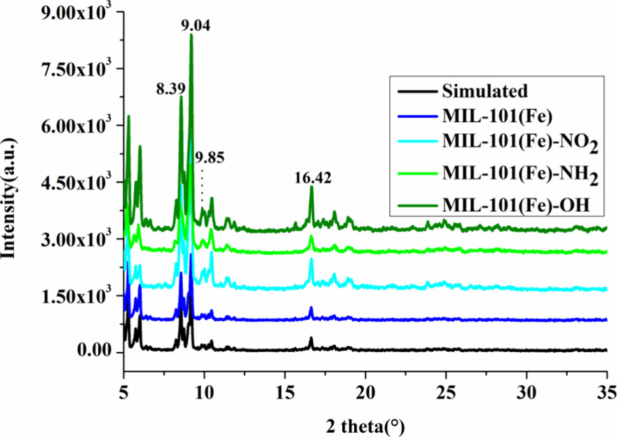 - X射线粉末衍射分析显示MIL-101(Fe)-X具有高结晶性,主要的衍射峰位于8.39°、9.04°、9.85°和16.42°。
