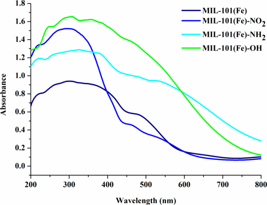 - 紫外-可见吸收光谱显示MIL-101(Fe)-X在200−800 nm范围内具有强烈的光吸收行为,特别是引入-NH2和-OH官能团后。