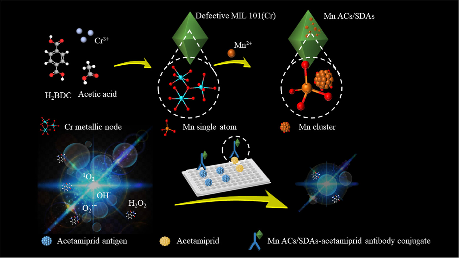 本文通过在醋酸调控的缺陷MIL 101(Cr)中植入Mn ACs/SDAs,成功制备了具有双重抗氧化活性的催化剂。这些催化剂具有高效的ROS消除能力和优越的CL信号淬灭效率。研究还建立了一种高灵敏度的CL免疫分析方法,用于检测乙酰甲胺磷,显示出良好的定量范围和检测限。这项工作为开发具有多重抗氧化活性的ACs/SDAs开辟了新途径,并拓展了它们在生物传感领域的应用。