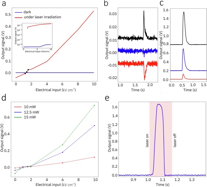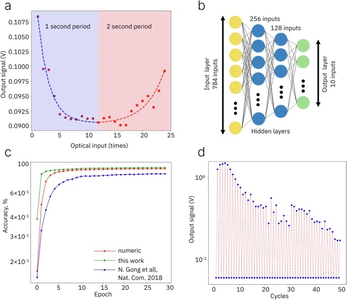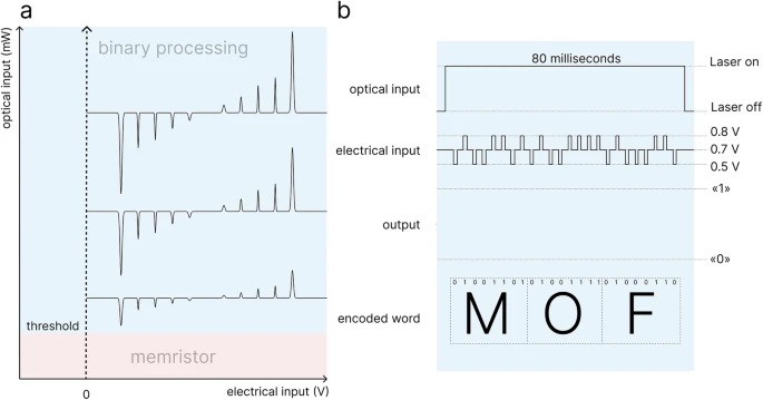 2. 研究表明,具有固有记忆行为的MOF在光照射下其电响应会发生非线性变化,从而产生三个及更多电子状态(脉冲),持续时间为81毫秒,并且具有1秒的不应期,这允许实现每秒40比特的光电数据处理。