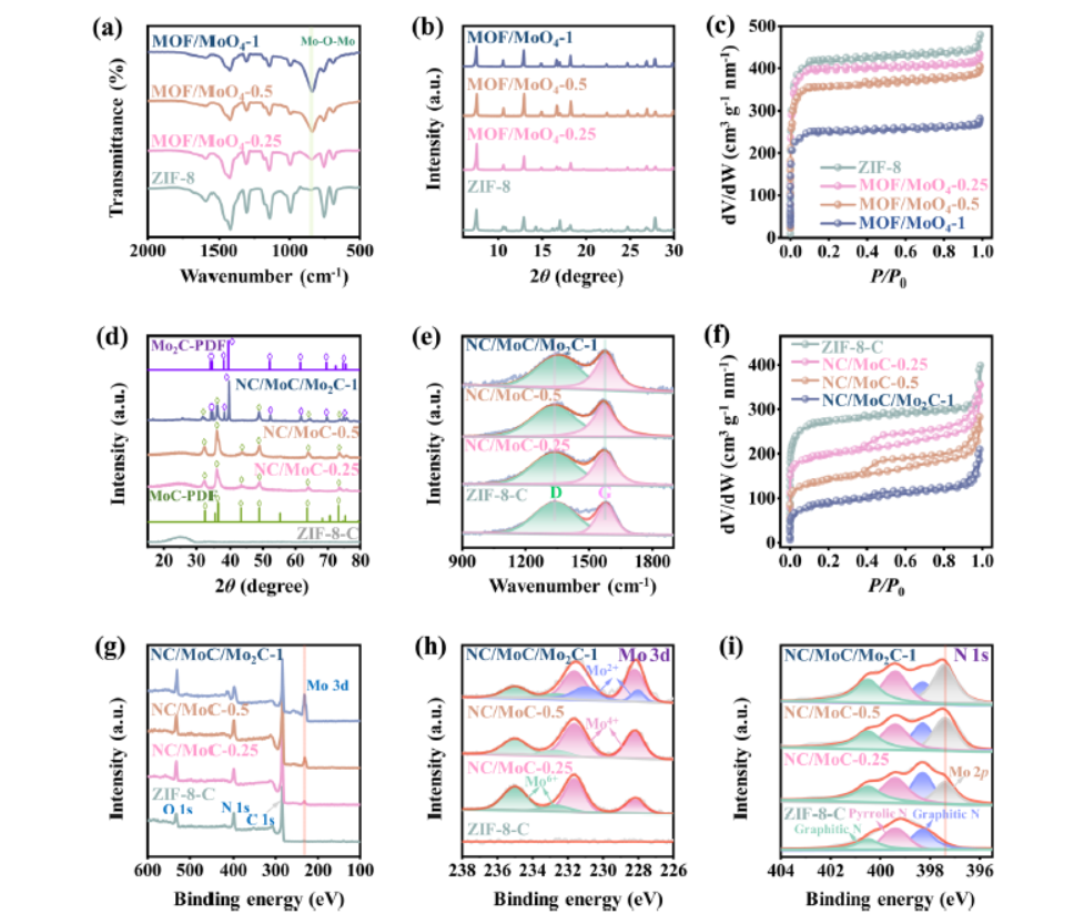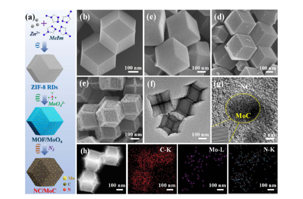 - 将MOF/MoO4在800 °C的氮气氛围中热解,生成含有高度分散的MoC纳米晶的NC/MoC。