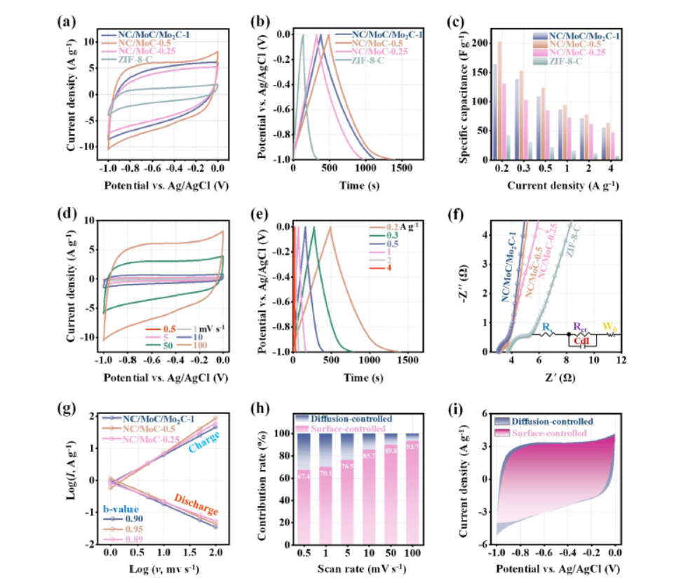 - CV和GCD测试结果表明NC/MoC-0.5电极具有最高的比电容(202.4 F g^-1)和最长的放电时间,显示出其在所有测试电极中最高的比电容。