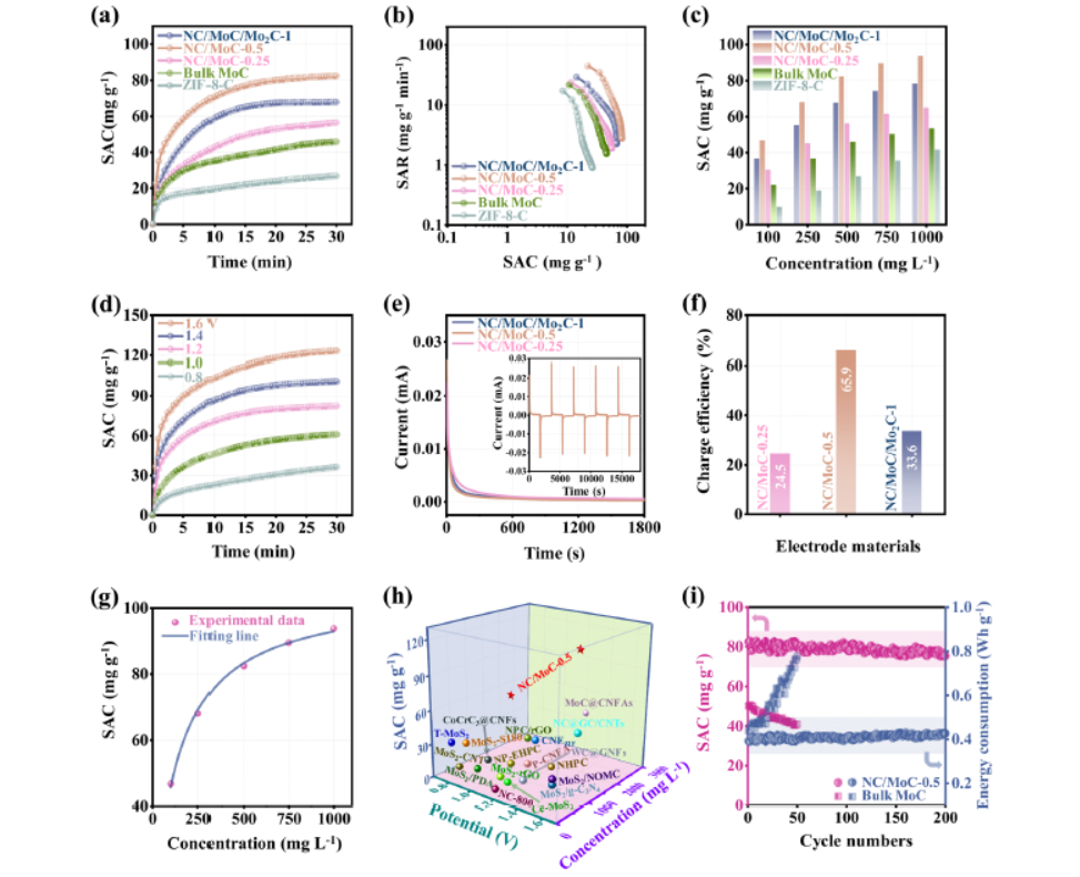 - NC/MoC-0.5电极在500 mg L^-1 NaCl溶液中表现出82.4 mg g^-1的超高SAC,显著高于其他电极。