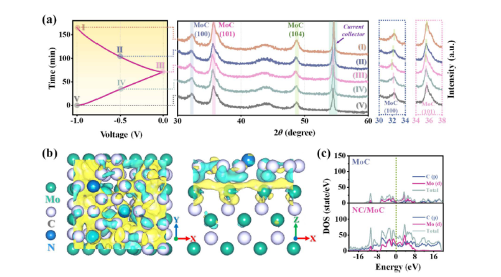 本文成功合成了一种新型的NC/MoC材料,通过MOFs的功能化和热碳化策略,实现了MoC纳米晶在氮掺杂碳基质中的均匀分布。该材料在CDI中表现出优异的性能,具有高SAC、快速脱盐速率和良好的循环稳定性。DFT计算和原位XRD表征进一步阐明了MoC纳米晶在脱盐/再生过程中促进电子传输的作用,从而提高了CDI性能。
