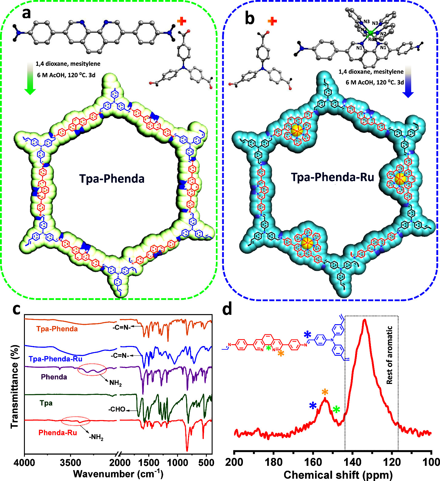 1) 将tris(4-formylphenyl)amine (Tpa)和Phenda/[Ru(Phenda)(bpy)2]2+在1,4-二氧六环和间三甲基苯的混合溶剂中,通过酸催化的席夫碱缩合反应在溶剂热条件下进行反应。