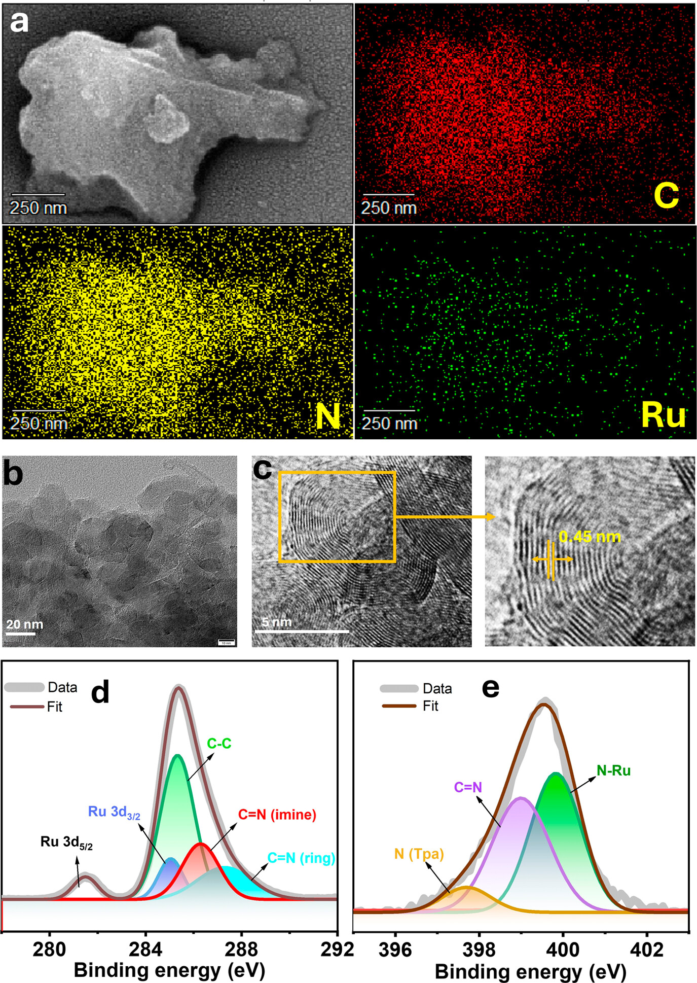 3. 表面物种分析:XPS分析显示Tpa-Phenda-Ru中Ru的存在,Ru 3d5/2和Ru 3d3/2的结合能分别为281.49 eV和285.05 eV。